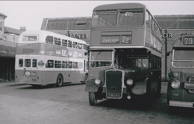 The Hants and Dorset fleet was at this time almost totally Bristol, with Ks, Ls and ever increasing numbers of Lodekkas the order of the day. In the late fifties most of the single deck Bristol Ls were still rear entrance, but the move to OMO was gathering pace. I have fond memories of travelling on these over route 73A to Lee on Solent and Hill Head. The early sixties saw some of these vehicles sent back to ECW for lengthening and conversion to front entrance for OMO purposes. One thing that kept the bus spotters interest in Hants And Dorset’s all Bristol fleet alive in those days was their use of colour coding fleet numbers for different garages. This meant that you could spot a rare interloper from , for instance Eastleigh, very quickly. this coding was carried on a small metal plate on the front and rear of vehicles. Fareham’s colours were Green background with black numerals, Southampton’s yellow background with black numerals and Winchester blue background with white numerals etc. In all their were nine different combinations. In NBC days the system was perpetuated for a while , but he plates were replaced by painting two different colour circles on the vehicles. One particular bus always springs to mind when I think of this time. It is 1334 – LRU 63 an ECW highbridge bodied KSW6G built in 1953. This particular vehicle always seemed to be running on route 73 to Heathfield Estate. No matter when I visited the bus station over a number of years it would be sitting there ready to depart on this route. I would imagine any enthusiast living on this route would be very frustrated by this lack of variety.